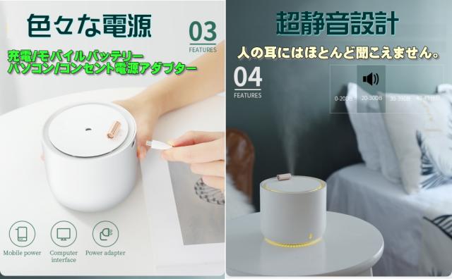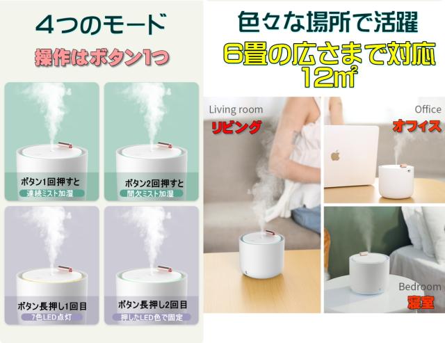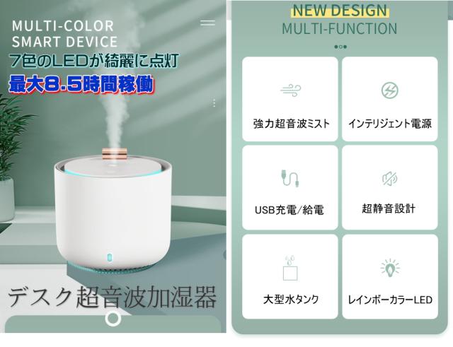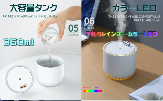 充電バッテリー/USB給電/レインボーカラーLED点灯/大容量加湿