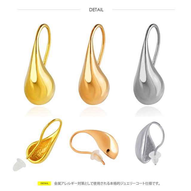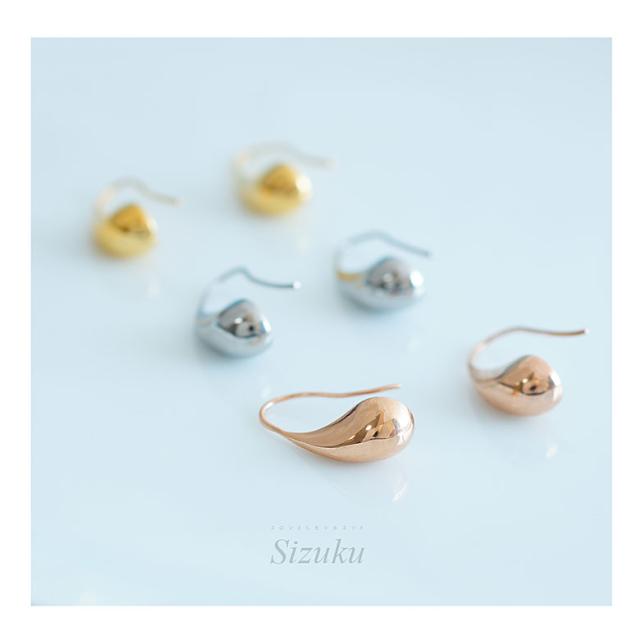 コロンとした雫形のピアスです。かわいらしいフォルムですが、上質で甘すぎないシルエットで女性らしさを引き立たせる美しいデザイン。美しく磨き上げたピアスにプラチナ仕上げのロジウムやPVDコートを施しているので金属アレルギー対策としても使えるピアスです。