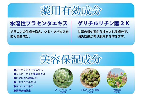 | 成分 | 水溶性プラセンタエキス、グリチルリチン酸2K、アクリル酸・メタクリル酸アルキル共重合体、濃グリセリン、米デンプン、混合植物抽出液-34、シルバーバイン果実エキス、カモミラエキス-1、酵母多糖体末、アーティチョークエキス、マロニエエキス、ヒアルロン酸Na-2、塩化トリPOE(5)ステアリルアンモニウム、BG、フェノキシエタノール |