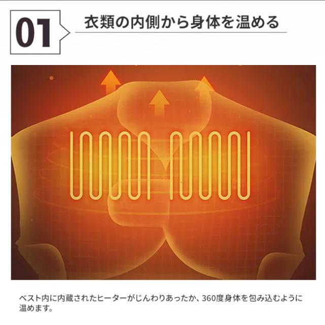 ジャケットの中に通った電熱線を電気の力で暖め、いつでもどこでもぽかぽか♪ 寒〜い冬の力強い味方、電熱ジャケット。 起動からわずか1分で熱を持ち、5分で最高温度に達する速熱・速暖仕様。ガーデニングや洗車、掃除など屋外の作業にはもちろん、スキーや釣り、サイクリング、ツーリングなどのアクティビティにもオススメです。 使い方はかんたん!別売りのモバイルバッテリーにケーブルを接続してボタンを押すだけ。10000mAhバッテリーで約10時間ご使用いただけます。使い捨てのカイロと違い繰り返し使えるのでとっても経済的。 ジャケットの内部には中綿がぎっしり詰められているので保温性抜群!内側には反射性の高いアルミプリントが施されているので体温を逃さずに暖かさをキープします。 ボタンを押すごとに設定温度が3段階に変化。その日の気候や室温に合わせて細かく温度を調節できます。 温度によってボタンの色が変化するので現在の設定がひと目でわかる! モバイルバッテリーを取り外せば洗濯機で丸洗いができるので、汚れを気にせずいつでも清潔にお使いいただけます。 |