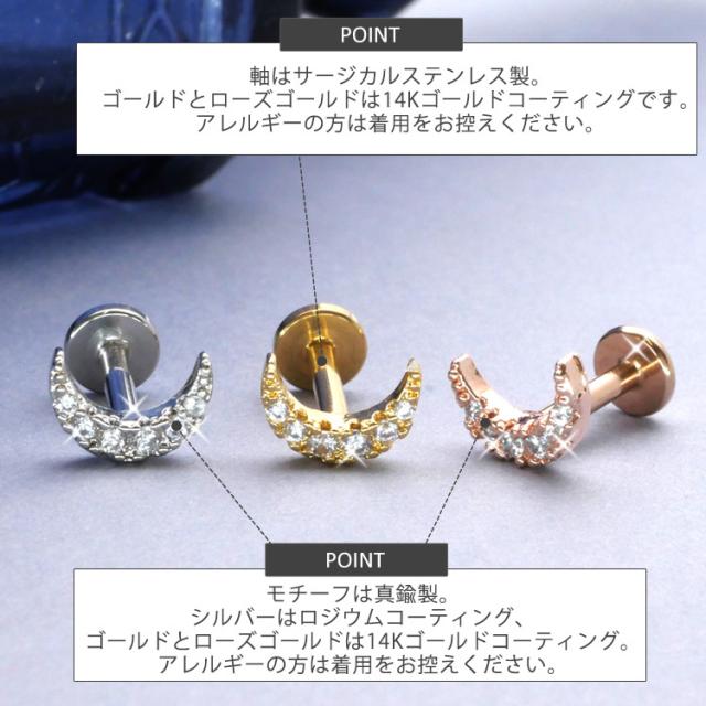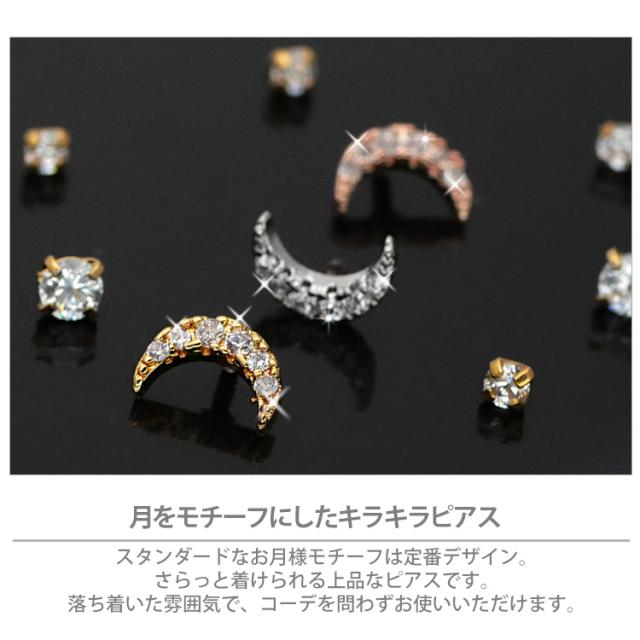 スタンダードな三日月型モチーフで個性的になりすぎないデザイン。大人がサラッと着けられる上品なピアスです。落ち着いた雰囲気で、年齢問わずお使いいただけます。ゴールドとローズゴールドモチーフは真鍮素材に14Kゴールドコーティングを施してあります。軸はサージカルステンレスに14Kゴールドコーティングです。金属アレルギーの方はお控えください。シルバーモチーフはロジウムメッキです。軸は金属アレルギーの方やお肌が敏感な方にも安心してお使いいただける、サージカル(医療用)ステンレス素材です!