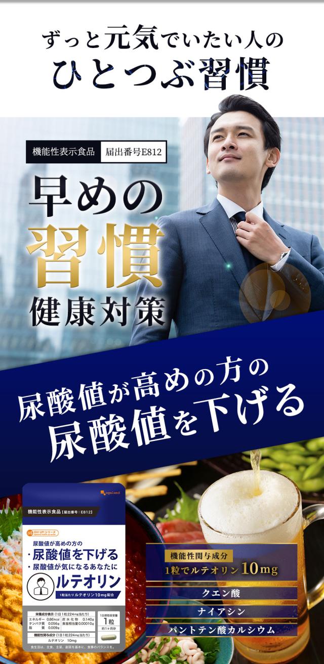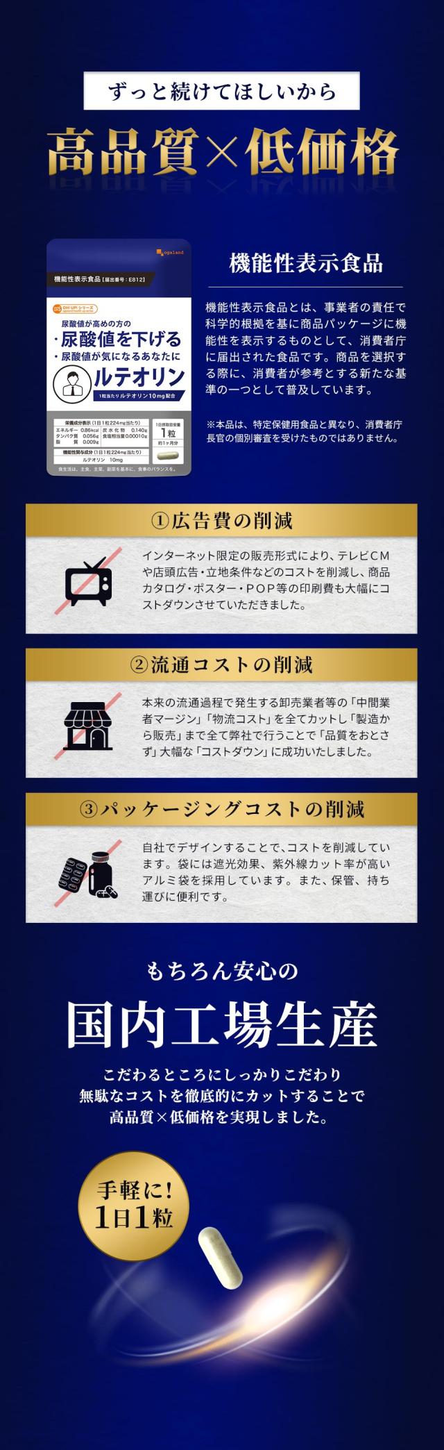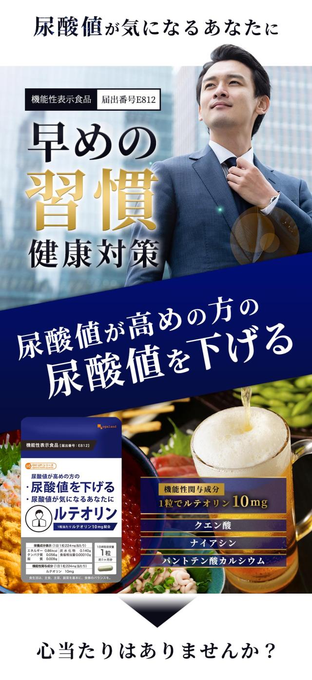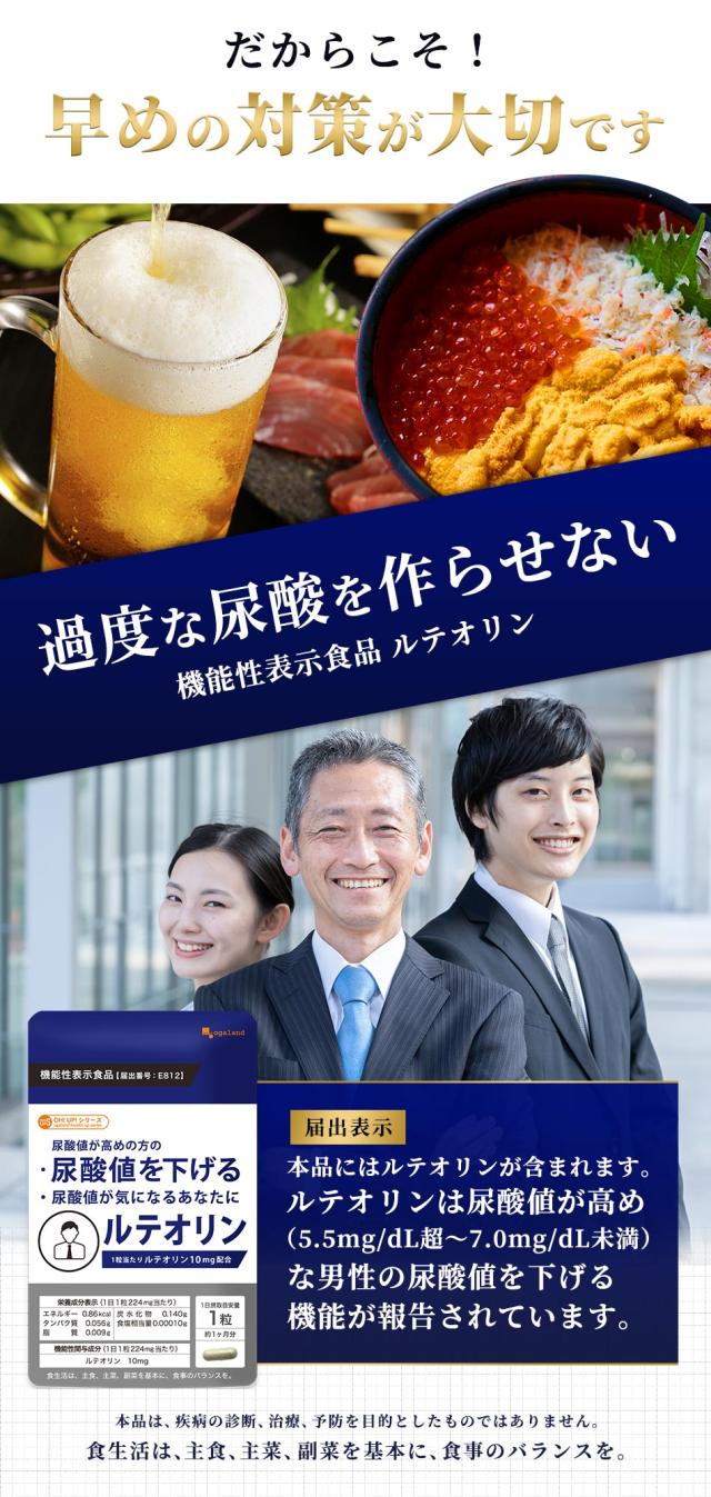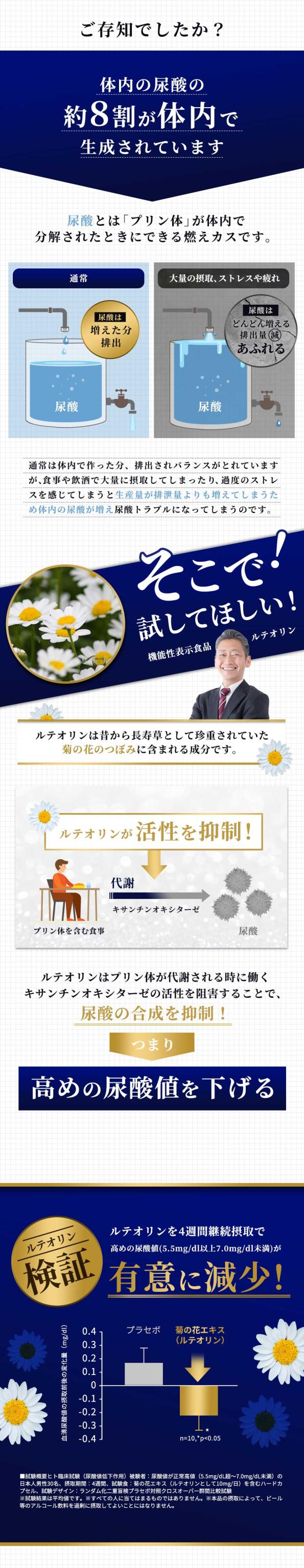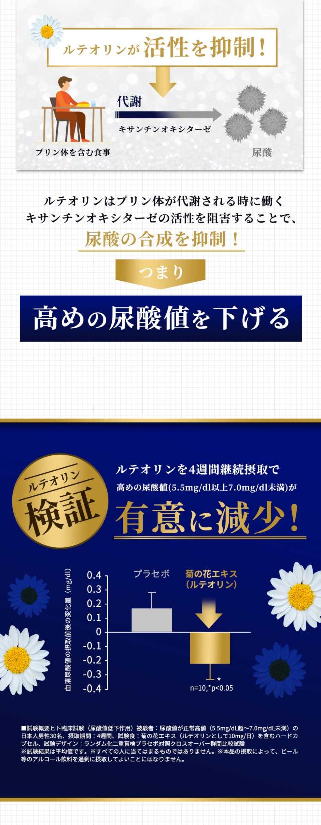 本品にはルテオリンが含まれます。ルテオリンは、尿酸値が高め(5.5mg/dL超〜7.0mg/dL未満)な男性の尿酸値を下げる機能が報告されています。