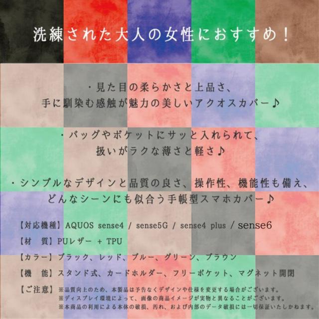 | 主な仕様 | ※実物の色に近づけるように心がけておりますが、お使いの環境により画像の色が実物の色と違って見える場合があります ※カメラ穴位置は対応機種によって異なります ●カラー: 以下からご選択ください ブラック / グリーン / ブラウン / レッド / ブルー ●対応機種: 以下からご選択ください ・AQUOS sense6 ・AQUOS sense4 (sense4 lite) / sense5G ・AQUOS sense4 plus |