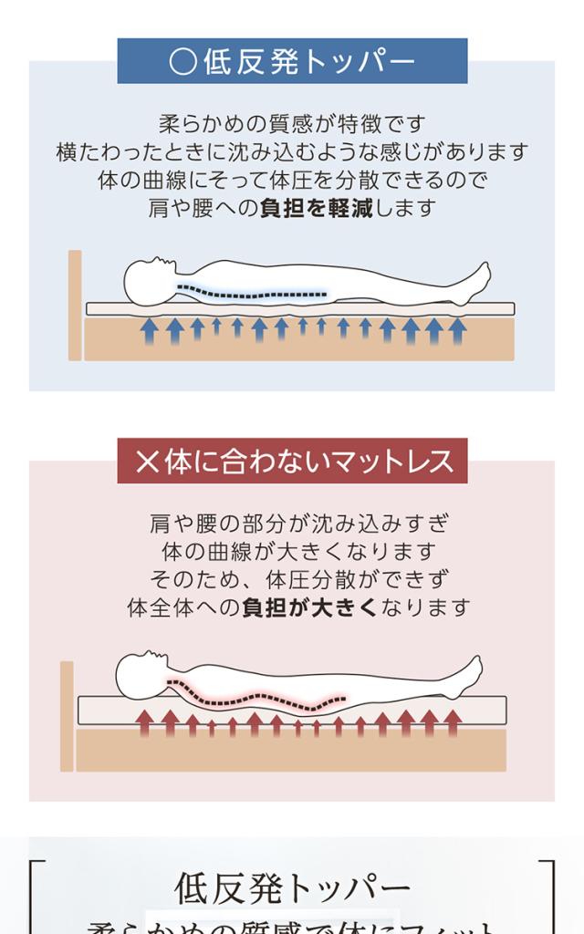 低反発トッパーは柔らかめの質感が特徴で、横たわった時に沈み込むような感じがあり身体にフィットします。