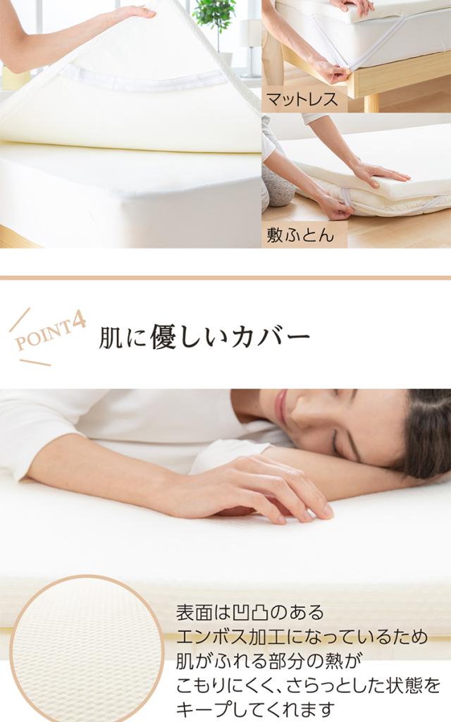 四隅をゴムバンドで簡単にしっかりと固定するのでずれにくく、またカバーは取り外し可能なので洗濯していつでも清潔にご使用頂けます。