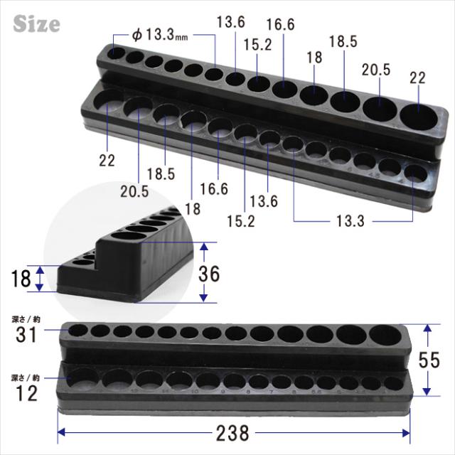 マグネットでソケットを保持し、簡単収納! ●ソケットを26個収納できる、2段のマグネット付ホルダーです ●マグネット仕様なので、キャビネットや工具箱などのスチール面に取付けできます ●差込むだけで簡単に収納でき、マグネットでソケットの保持も可能です ●深さの違う2列になっており、スタンダードタイプとディープタイプに対応します ●工具箱内でのソケット整理に最適です ※ソケットは付属しません ※入荷時期により仕様が若干変更となる場合が御座います ご使用に問題のない場合(返品/交換)はお受けしておりませんのでご了承ください |