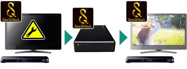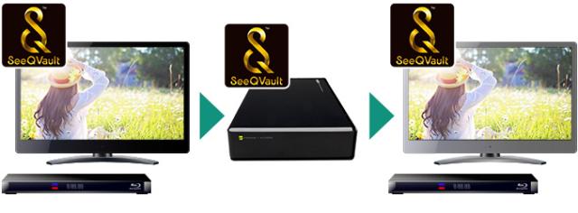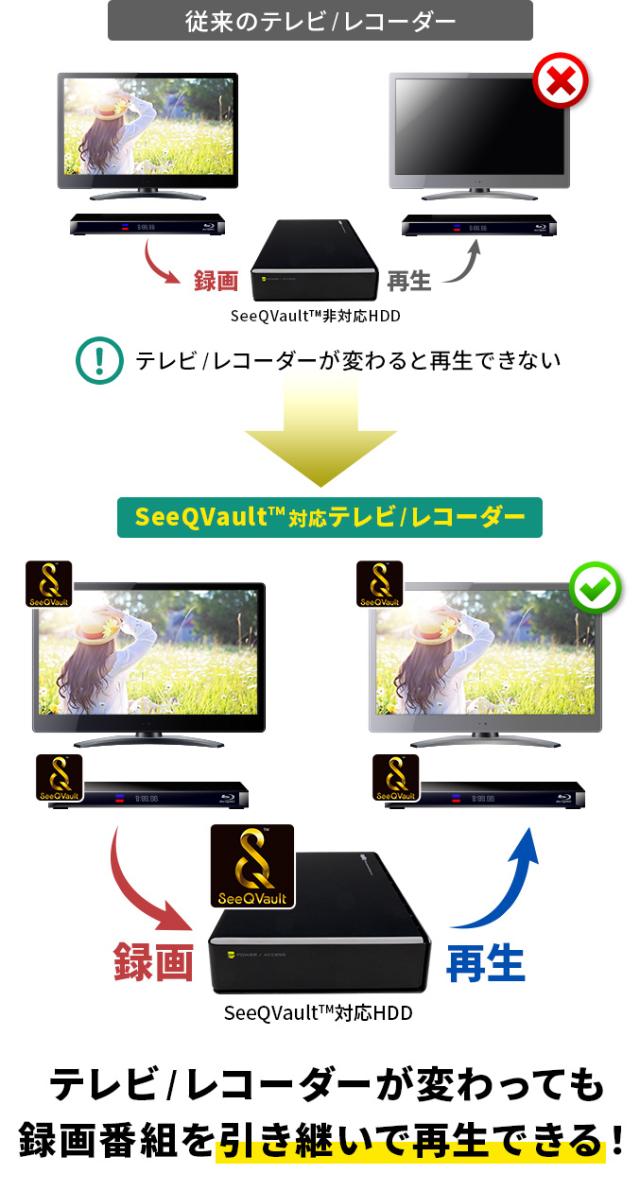 従来の録画方法では映像コンテンツ保護のため、別のテレビやレコーダーで再生することができませんでしたが、SeeQVault(TM)対応のハードディスクなら録画した番組を別のテレビやレコーダーに変えても、引き継いで視聴することができます。