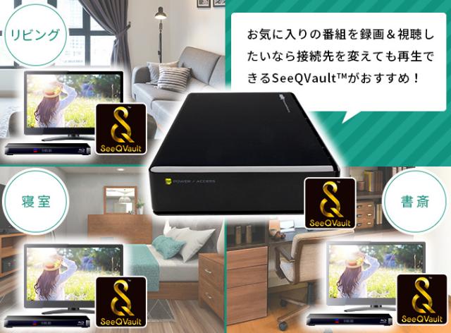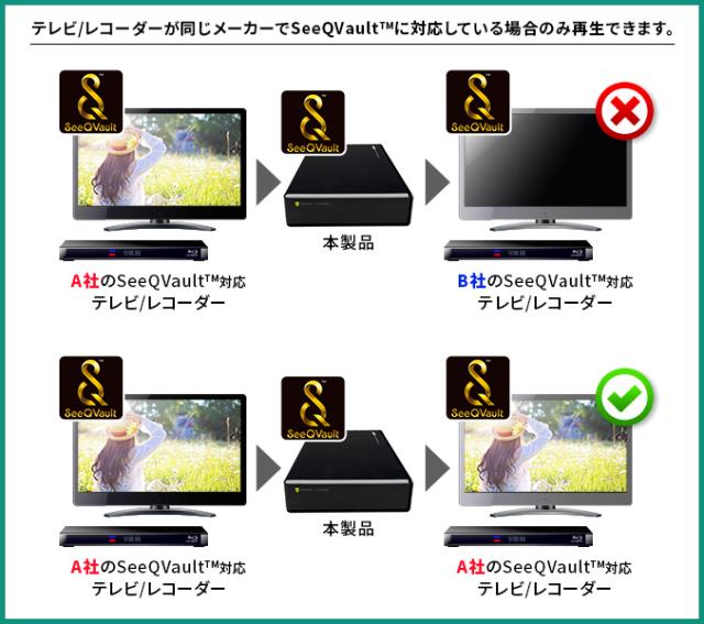 ※SeeQVault(TM)対応の外付けHDDをブルーレイレコーダーで使う場合、外付けHDDにはテレビ番組を直接録画できず、レコーダー側の内蔵HDDに録画したのち、SeeQVault(TM)対応のHDD側にダビングする必要があります。