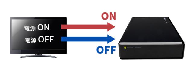 テレビやレコーダーのON/OFFに連動して自動的に本製品の電源もON/OFFになる電源連動機能を搭載。また、ハードディスクのアクセス状態を監視し、一定時間アクセスが無い場合、ハードディスクのモーターを停止する省電力機能を搭載しているため消費電力の低減になります。