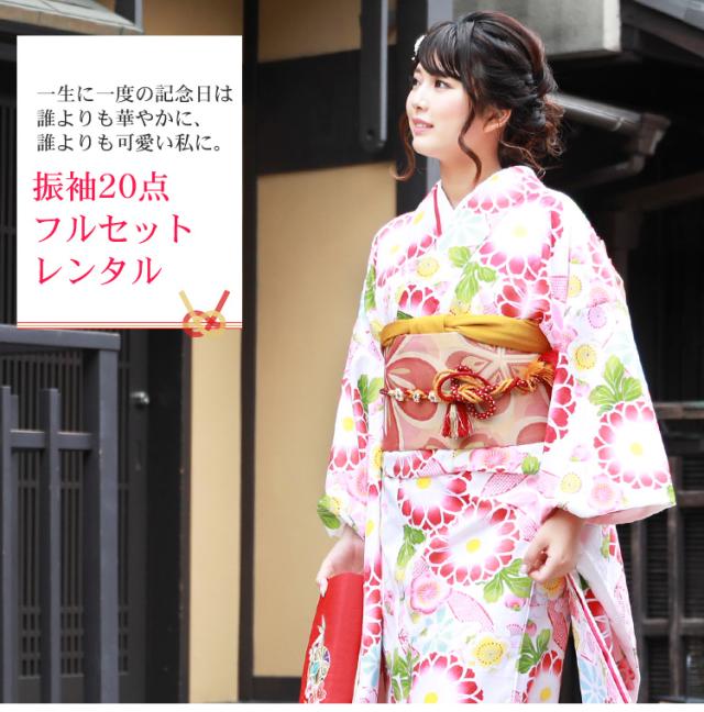 【レンタル】【最大20日間】当店オリジナル 成人式 振袖 レンタル 20点フルセット 派手「白地に七宝と菊」 成人式 結婚式 フォーマル 小紋柄