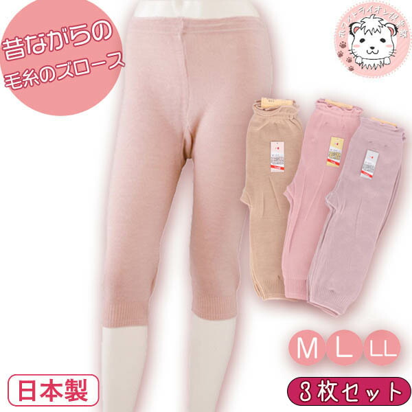 昔ながらの毛糸のズロース 毛混 横編み 7分長ズロース 3枚セット 防寒 冷え防止 M/L/LL | レディース 毛糸 パンツ 日本製 七分丈 ひざ下 七分長 毛糸パンツ