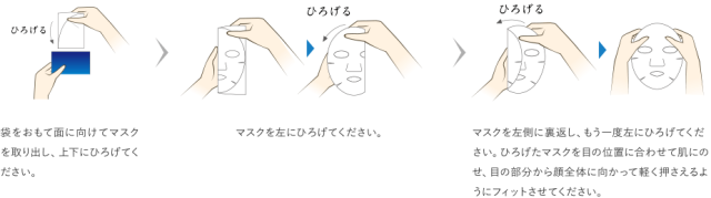 ローションをご使用の後、マスクを袋から取り出し広げて顔にのせます。