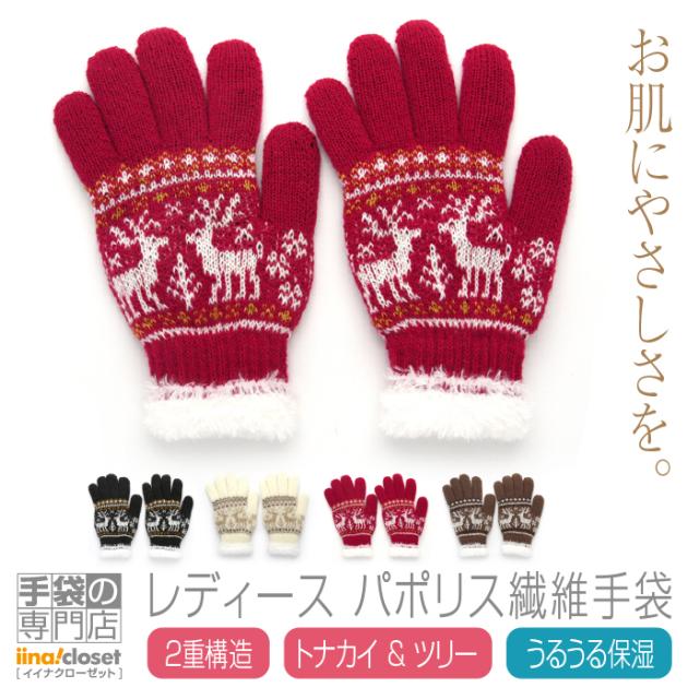 【商品の特長】◆外側はニット生地、内側はモール生地とスクワラン配合繊維の「パポリス®」がお肌を優しく包み込む2重構造♪◆カフス部分はふわふわなショートファー♪◆リブ編みカフスが、手首にしっかりフィット。冷気が内部に侵入しにくい設計♪◆秋冬コーデに取り入れたい人気のノルディック柄(トナカイ&ツリー)♪◆ブラック、アイボリー、レッド、ブラウンの全4色。◆安心安全の日本製。