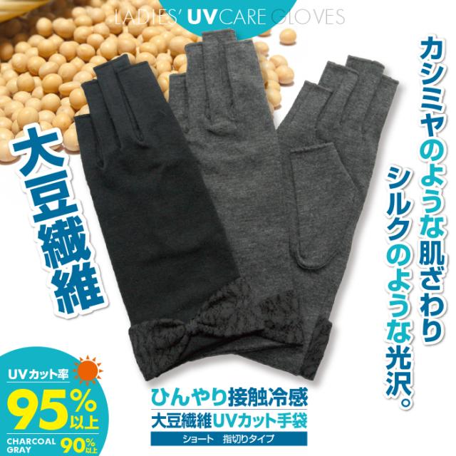【商品の特長】◆指切りタイプなので、スマホもタイピングもラクラク♪◆素材はお肌にやさしく、吸湿性、放湿性、通気性に優れた「大豆繊維」使用♪◆大豆繊維は大豆タンパクの活性化により紫外線の吸収、反射機能もあるので、UVアイテムの素材としても優等生です♪◆カフス部分に同系色のレースリボンがプチかわいい♪◆ブラック、チャコールグレーの全2色展開。