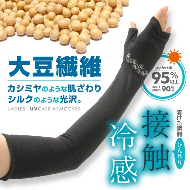 【商品の特長】◆素材はお肌にやさしく、吸湿性、放湿性、通気性に優れた「大豆繊維」使用♪◆大豆繊維は大豆タンパクの活性化により紫外線の吸収、反射機能もあるので、UVアイテムの素材としても優等生です♪◆指なしタイプなので、指先自由♪スマホやお財布からカードを出す時にも便利♪◆花柄ラインストーンがアクセント♪◆カラーはブラック、ライトグレー。