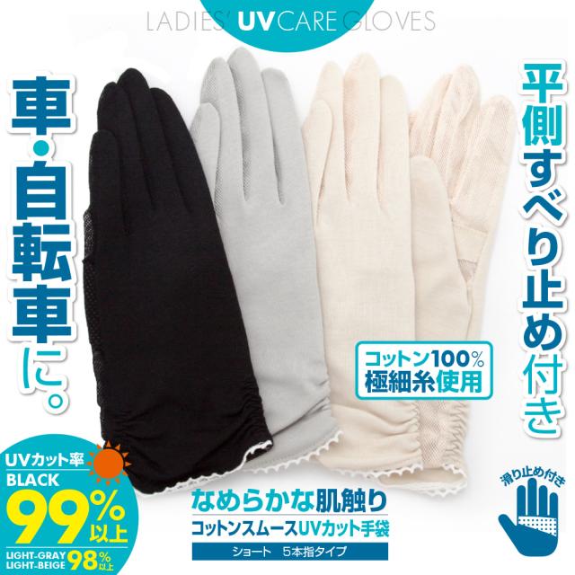UVカット 手袋 ショート おしゃれ レディース 滑り止め 指あり 甲側コットン100% 平側メッシュ 裾口レース ブラック グレー ベージュ