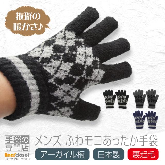 手袋 メンズ 裏起毛 ニット 暖かい 冬 手作業 ふわモコ アーガイル柄 日本製
