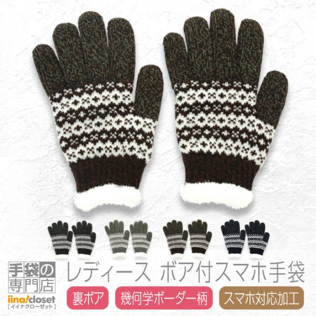 手袋 レディース スマホ対応 暖かい おしゃれ スマホ 日本製 冬 ボア ニット 2重構造 幾何学柄 ボーダー