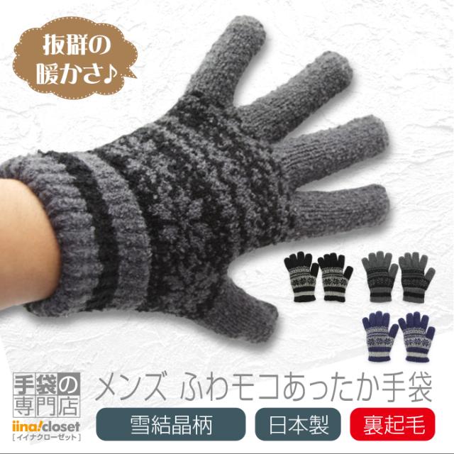 手袋 メンズ プレゼント 暖かい 裏起毛 おしゃれ 日本製 冬 ニット ふわモコ 雪結晶柄