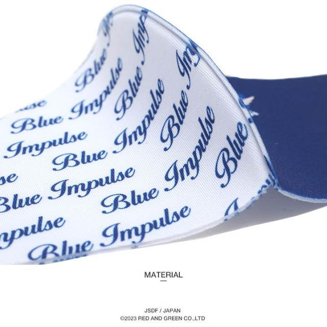 スクリプト(筆記体)ロゴの「総柄」とブルー地にブルーインパルスを象徴する「エンブレム」をアシンメトリー(左右非対称)で配置したスペシャル感漂う仕上がり。
