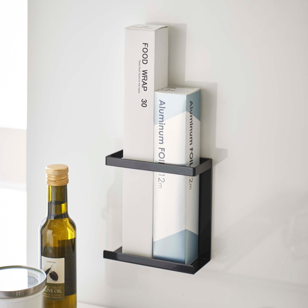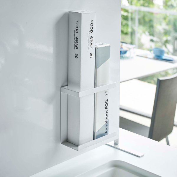 ラップやアルミホイル、クッキングシートなどの収納に便利なラップホルダー。特にラップはお料理中の使用頻度も高く、すぐに手に取れる場所に置くことでお料理もはかどります。ラップ以外にも、ポリ袋箱など縦長のアイテムも収納が可能なので、アイデア次第で使い道が広がります。