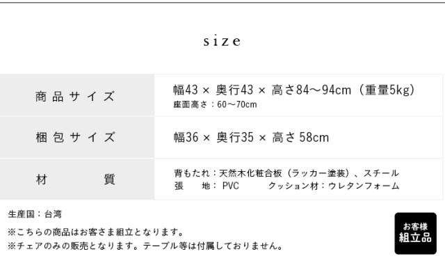 W43 × D43 × H84〜94cm(座面高さ60〜70cm)