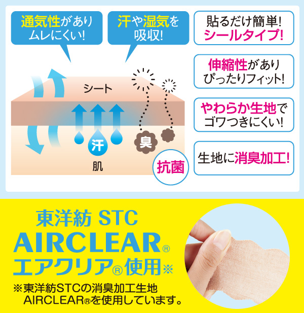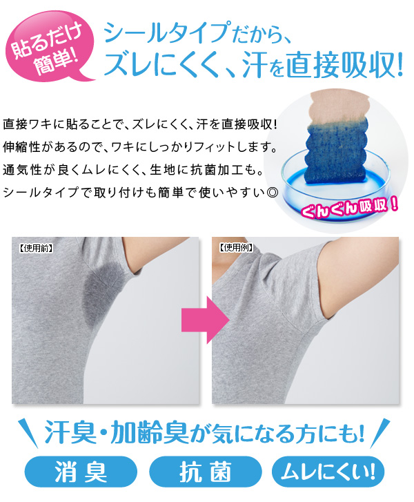 ムレにくく、汗や湿気を吸収!貼るだけ簡単シールタイプで、ズレにくい。