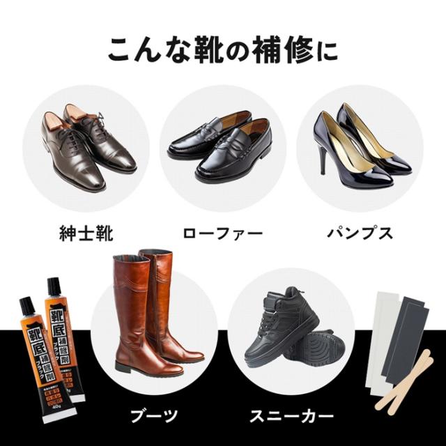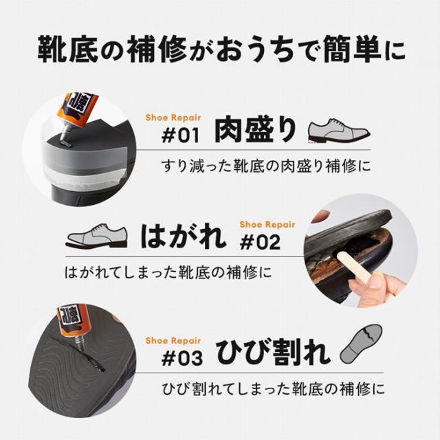ゴムや皮革への接着性に優れており、ハガレや破けの補修にも使えて便利な靴底修理キット。