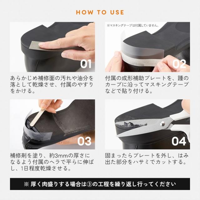 乾燥後は弾力のあるゴム状になるので、靴底のすり減り部分の肉盛り補修やヒビ割れも、簡単に補修する事ができます。