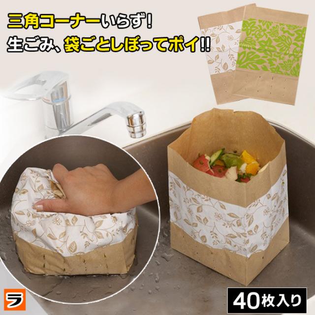 袋に小さな穴が開いており、上から押すと野菜くずや生ゴミの水分だけが抜け、ギュッと搾ってそのまま捨てられる紙のゴミ袋。