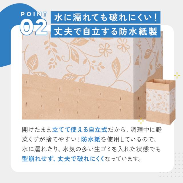 放水紙を使用しているので、生ゴミを入れた状態や水に濡れた状態でも型崩れしにくく、丈夫で破れにくいのが特徴の生ごみ入れです。