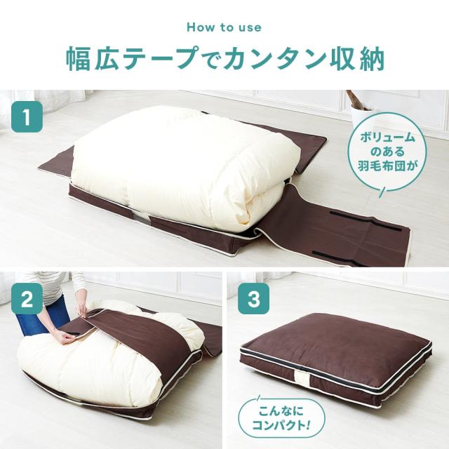 2本のクロステープで留めでファスナーを締めるだけと使い方も簡単。圧縮袋のように掃除機で吸う必要もなく、布団をギュッと圧縮する必要もありません。