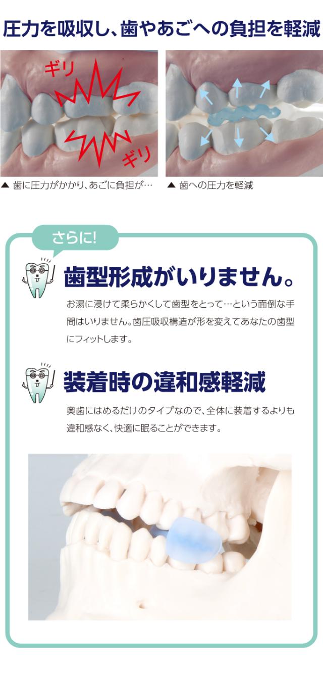 寝る時にはめるだけで歯圧が吸収分散し、奥歯に負担をかけることなくピタっと止まります。