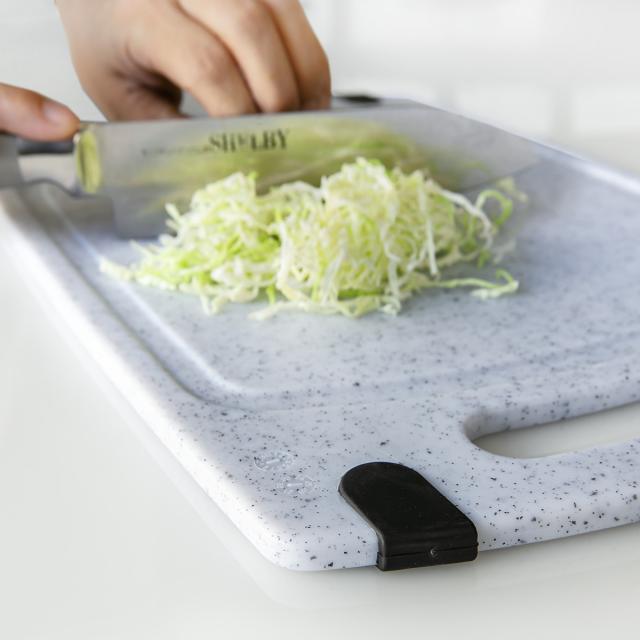 大きめの食材を切ったり、キャベツの千切りをしたり、毎日の料理に欠かせない、使い勝手のいい大きさのまな板です。石目調(マーブルストーン)で調理台やカウンターにも調和し、包丁の傷が目立ちにくい高級感のある素材が特徴です。