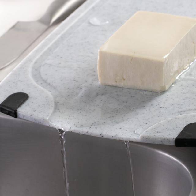 まな板の周りが汚れないよう漏れを防止する溝と、水切りスロープが付いており、ここから野菜の水分や肉汁などを流せます。食材を鍋などに移す時のガイドとしても使えます。