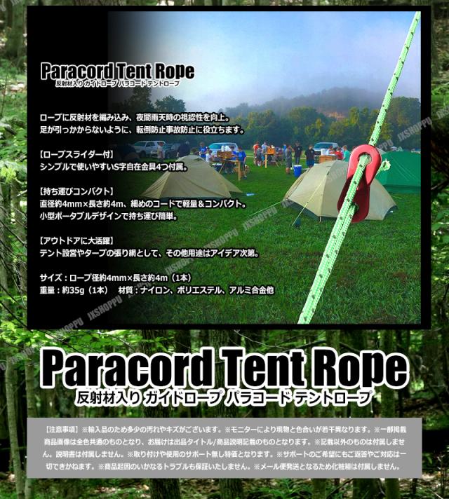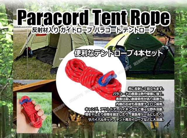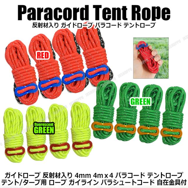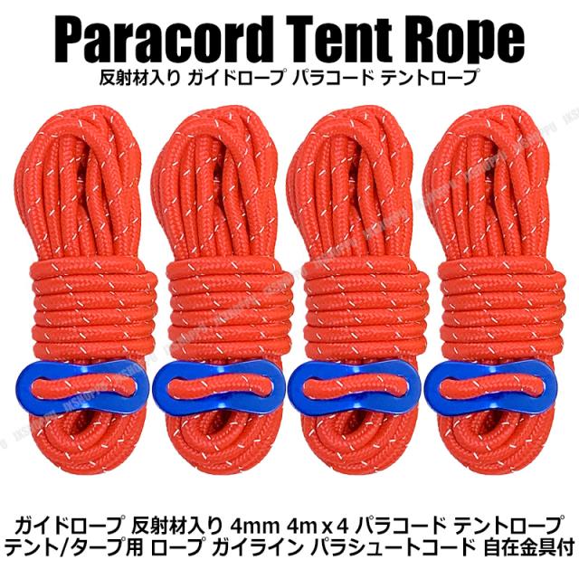 ガイドロープ 反射材入り [レッド] テントロープ パラコード 4mm 4m 4本 多用途ロープ テント用 タープ用 ロープスライダー付 送料無料