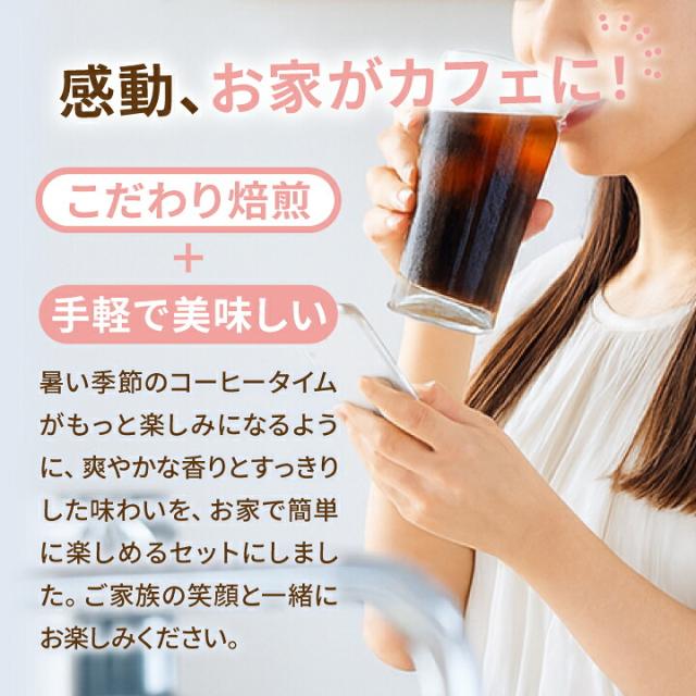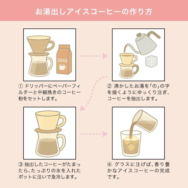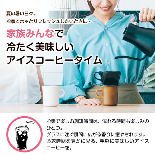 | こんな方にオススメです | 1. 夏にピッタリ!アイスコーヒーを楽しみたい方に 暑い季節にお家で手軽にアイスコーヒーをお楽しみ頂きたい方にぴったり。暑い日のリフレッシュに最適です。 2. アイスカフェオレに最適 ミルクをたっぷり入れてアイスカフェオレにすると美味しい。自宅で手軽にカフェオレが楽しめるため、ミルク好きな方にもおすすめです。子どもから大人まで楽しめます。 3. 水出しコーヒーの簡単さ 水出しコーヒー用に購入する方も多く、簡単に作れて美味しいと評判です。専用ボトルで水出ししておけば、いつでも手軽に美味しいアイスコーヒーが楽しめるので、忙しい朝やお昼に便利です。 |