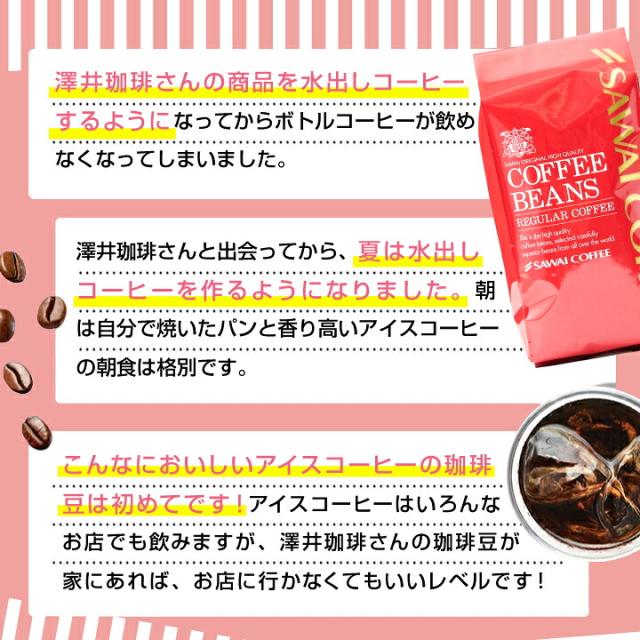 - 今年の夏は、家族からアイスコーヒーを常備して欲しいとお願いされて、久々に澤井さんのお世話になりました。 いつもは豆で注文していましたが、一度に使う量が多いので、中挽きでお願いしました。 家族に美味しいと言われて、私も満足です!
