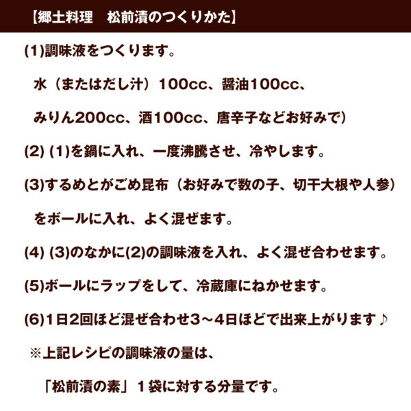 ※上記レシピの調味液の量は、「松前漬の素」1袋に対する分量です。