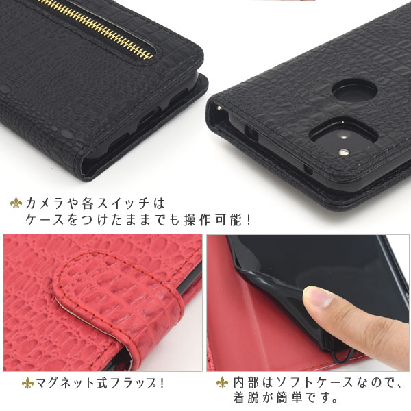 衝撃やキズなどからスマートフォンを守ります。 また、内部はソフトケースなので着脱が簡単です。 背面を折り返すとスタンドとして使用できるので、動画視聴に便利です。 横開きタイプなので、手帳のように使うことができます。 落下防止に最適なストラップホール付きです。 外側にファスナーポケットが付いているので、ちょっとした財布や小銭入れ代わりになって便利! また、内側に2つのカードポケットとサイドポケットが付いています。 高級感溢れるクロコダイルレザーデザイン。 ビジネスやカジュアルなど様々なシーンで活躍します。 ※Google Pixel 4a専用です。Google Pixel 4a (5G) では使用できません。 | ||||||||||||||