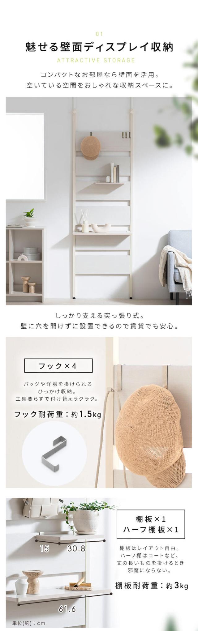 突っ張り棚 壁面収納 おしゃれ 突っ張り ラック つっぱり 壁棚 玄関 棚 収納 幅62 ウォールラック パーテーション 仕切り ウォールシェルフ 壁掛取り付け スリム 北欧 薄型 一人暮らし WLR-HT62 HIROBIRO