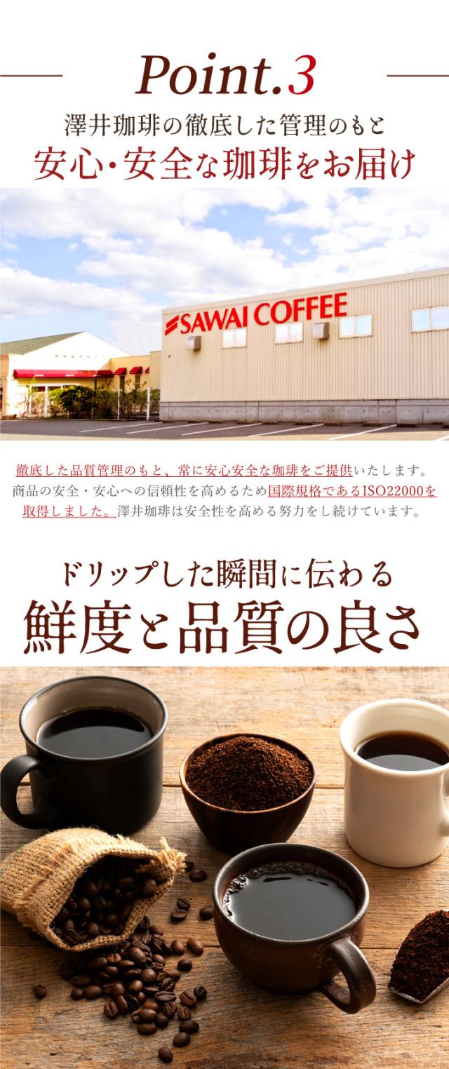澤井珈琲(さわいこーひー)では、お客様のお家に商品が届き、箱を開けた瞬間。そして、トレードマークの赤いコーヒー袋の封を開けた時に鮮度抜群の「香り高さ」と、飲んだときの「味わい」に感動して頂けるように、レギュラーコーヒーはご注文を頂いてから焙煎をして焼きたてのコーヒー、コーヒー豆、珈琲、珈琲豆をお届けをしている焼き立て珈琲専門店です。お客様に「美味しい」と言って喜んで頂く事が私たちの喜びと思ってます。「美味しいコーヒーをお届けしたい」と想い続けて生まれたこだわりの味を、どうぞ、この機会にお楽しみくださいませ。澤井珈琲では、コーヒー豆は挽き方がご選択いただけます。珈琲豆を挽く事をお楽しみ頂ける『豆のまま』や、私共の専用の特注サイズの大型のミルで挽いて、コーヒー粉の状態にしてお届けする方法がございます。中挽き、細挽き、粗挽き、荒挽きなど様々な挽き方がございますが、私共がお薦めする『店長のおすすめ挽き』にて、そのコーヒーに合った一番美味しいと思える挽き方に挽いてお届けします。東京の銀座にも実店舗を構え、都内では浅草やスカイツリーのあるソラマチにも出店。「鳥取のコーヒー屋さん」とも呼ばれてますが、空気が綺麗で自然豊かな鳥取県に焙煎工場を構え、隣接する島根県の松江市や出雲市にも実店舗がございます。顔の見えないネット通販ですが、全国11店舗を展開する安心安全な澤井珈琲は、特徴的な「赤いコーヒー袋」に入れて、全国の珈琲好きにお選び頂いてます。よく間違えられる名前として、沢井珈琲、沢井コーヒー、澤井珈琲店、澤井珈琲本店、さわいこーひー、サワイコーヒーなどがございますが、正式名称は澤井珈琲となります。