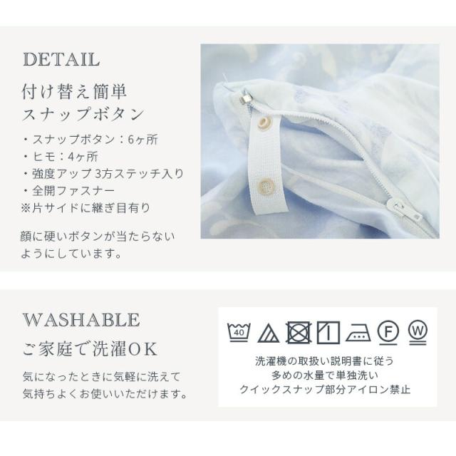 | 【高スペックの羽毛布団ほどカバーが重要】 羽毛は寒くなると羽枝を伸ばして空気を取り込み、ふわふわと膨らんで暖かな空気を溜め込みます。せっかく良い羽毛布団を選んでも、布団を包むカバーが重たく通気性のないものだと、羽毛の心地よさを充分に引き出すことができません。スペックの高い羽毛布団ほど、その保温力と心地よさを充分に引き出すために、品質の高いカバー選びが大切です。 【貴重で高級なインド超長綿を使用】繊維の長さが35mm以上と非常に長く、地球上の綿花のうちたったの5%しか採取できない貴重な超長綿。そのの中でも最高級品として有名なインド超長綿を使用しました。コットンでありながらシルクのような艶やかな光沢があり、吸湿性もよいので高級な羽毛布団の側生地にも多く使用されます。 【艶やかな生地60サテン】60番手の細めの糸を使用してサテン(朱子)織りで生地を作りました。 タテとヨコの糸の交差点が少ないサテン生地は高級感あふれる光沢と滑らかな肌触りを生み出します。 【使い始めからふんわり、エアータンブラー加工】反物にエアー(空気)の圧をかけて繊維・糸を揉み解す加工で、表面がわずかに毛羽立ち、綿本来の持つふんわり柔らかな生地に仕上がります。開封直後から良い意味で使い込んだような自然なふっくら感をお楽しみいください。 【細部まで寝心地にこだわりました】布団とのズレを防止するヒモは、顔に当たらない部分のみ硬いボタン付きにすることで肌あたりに配慮しました。またファスナー部分以外の3方には、耐久性をアップするステッチ加工を採用しています。 【信頼の純日本製 J∞QUALITY】「J∞QUALITY (ジェイクオリティ)」とは、織り・編み、染め、縫製、そのすべてを国内で行った、純正の日本製であることを示す認証であり、 厳しい基準をクリアした安心して購入できる安全な商品であることを意味します。従来のMADE IN JAPANを超えて、ものづくりへの「情熱」や「こだわり」がある商品のみに与えられる統一ブランドです。 | |