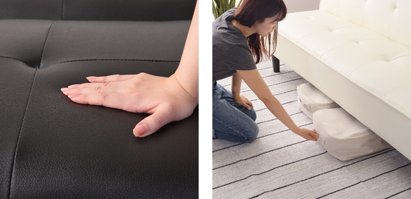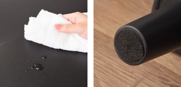 | お手入れ簡単 光沢が美しいレザータイプのソファベッドは汚れに強く、サッと拭くだけでよいのでお手入れも簡単です。 | キズ防止フェルト 脚部が床を傷つけにくいフェルト付きなので安心です。 |