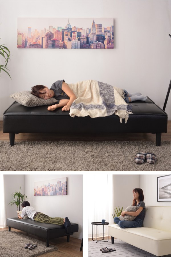 背もたれを倒すとベッドになるソファベッドです。少し休憩したい時や、お昼寝の際にはベッドとしてご使用いただけます。アームレスタイプなのでベッド時も広々と横になれます。また、ソファとして使用する際は座面の奥行が広いのでゆったりとくつろぐことが出来ます。限られたスペースにソファもベッドも置きたい方にピッタリです。