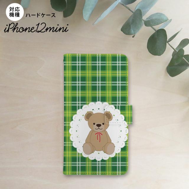 iPhone12mini iPhone12 mini 5.4 手帳型スマホケース カバー くま チェック レース 緑
