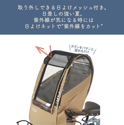 ・上カバーのボタンに付属の日よけメッシュを取り付け、直射日光からお子さまを守ります。