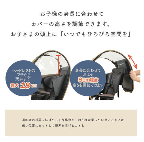 - 雨と風対策に買いました。 取り付けは説明書を見ながら簡単に出来ました。 が、これを付けると乗りながら会話が出来ず、2歳の息子は嫌がって乗ってくれなくなったので一度付けて試しに乗せただけで直ぐに外しました。