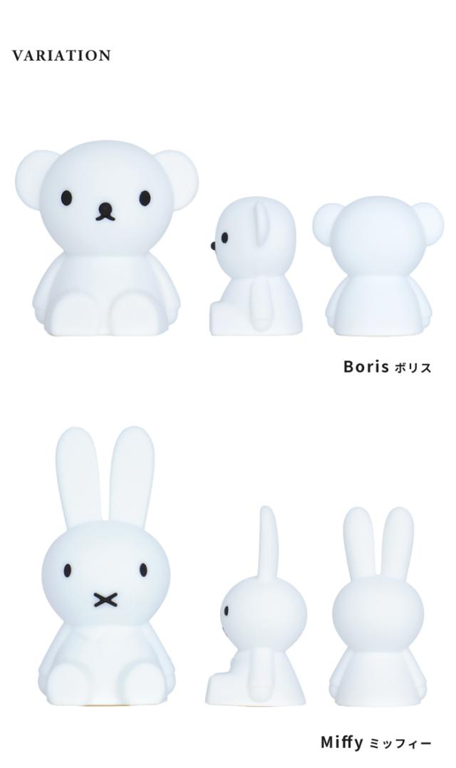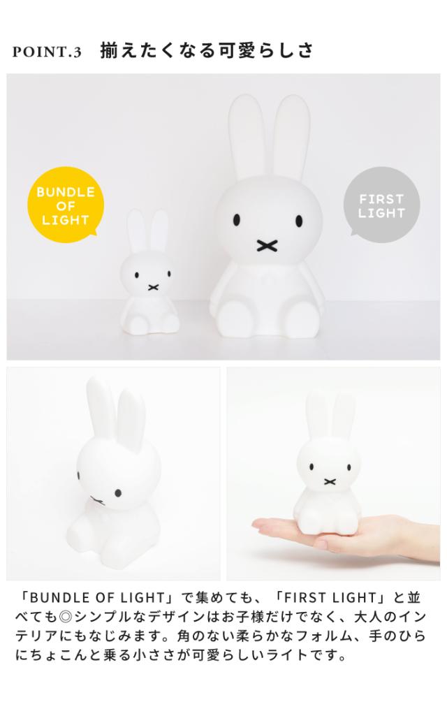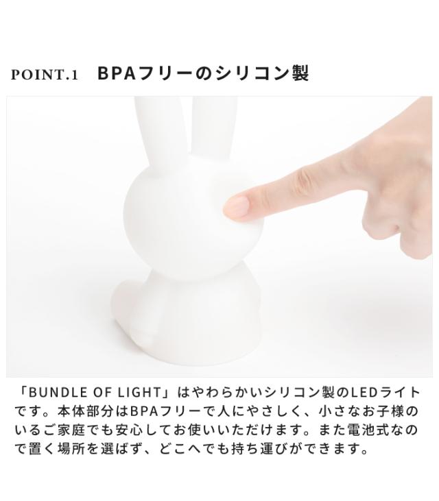 世代をこえて多くの人に愛され続けているディック・ブルーナの名作絵本Miffy(ミッフィー)のインテリアライト「FIRST LIGHT miffy and friends」が、スモールサイズになって「Bundle of Light」として誕生。“Bundle”は“生まれたての赤ちゃん”という意味を持ち、その小さくやわらかい光は気持ちまでも明るく照らしてくれます。本体部分はBPAフリーのソフトシリコン製。人にやさしく小さなお子様のいるご家庭でも安心してお使いいただけます。また、電池式なのでどこへでも持ち運びができ、ナイトライトとしても最適。手のひらサイズで揃えたくなる可愛らしさ。贈り物にもおすすめです。