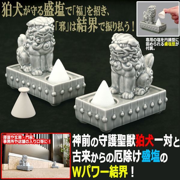 厄除け結界ダブルパワー!狛犬の盛塩一対セット (粗塩 円錐 愛知県瀬戸市 魔除け 幸運 開運 入り口 店舗 事務所 門前 瀬戸物 陶器)